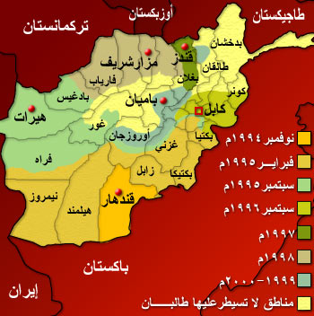 قال مسؤولون، اليوم الأحد، إن عمليات حركة طالبان عبر شمال أفغانستان اكتسبت زخماً خلال الليلة الماضية، مع استيلاء قواتها على مناطق من القوات الأفغانية الفارة، والتي فر مئات منها عبر الحدود إلى طاجكستان. نشأت الحركة الإسلامية الدينية المعروفة باسم طالبان في ولاية قندهار الواقعة جنوب شرق أفغانستان على الحدود مع باكستان عام 1994م، على يد الملا محمد عمر، وهو أبو طالبان حيث رغب في القضاء على مظاهر الفساد الأخلاقي. وفي نوفمبر 1994 بدأت طالبان بالظهور، وخلال عامين سيطرت على معظم مناطق أفغانستان ودخلت كابول عام 1996 وأعلنت نفسها الحاكمة للبلاد بإزاحة رباني وحكمتيار الذي وقع مع رباني اتفاقية عام 1996 أيضا تقضي. تمرّ أفغانستان بمرحلة انتقالية صعبة للغاية، تراوح بين السباق الميداني الذي تخوضه حركة طالبان للسيطرة على مواقع جديدة، والسعي الأميركي لتأمين ظهر الشرعية الأفغانية بعد إتمام الانسحاب. Jun 22, 2021 · حكومة أفغانستان:
